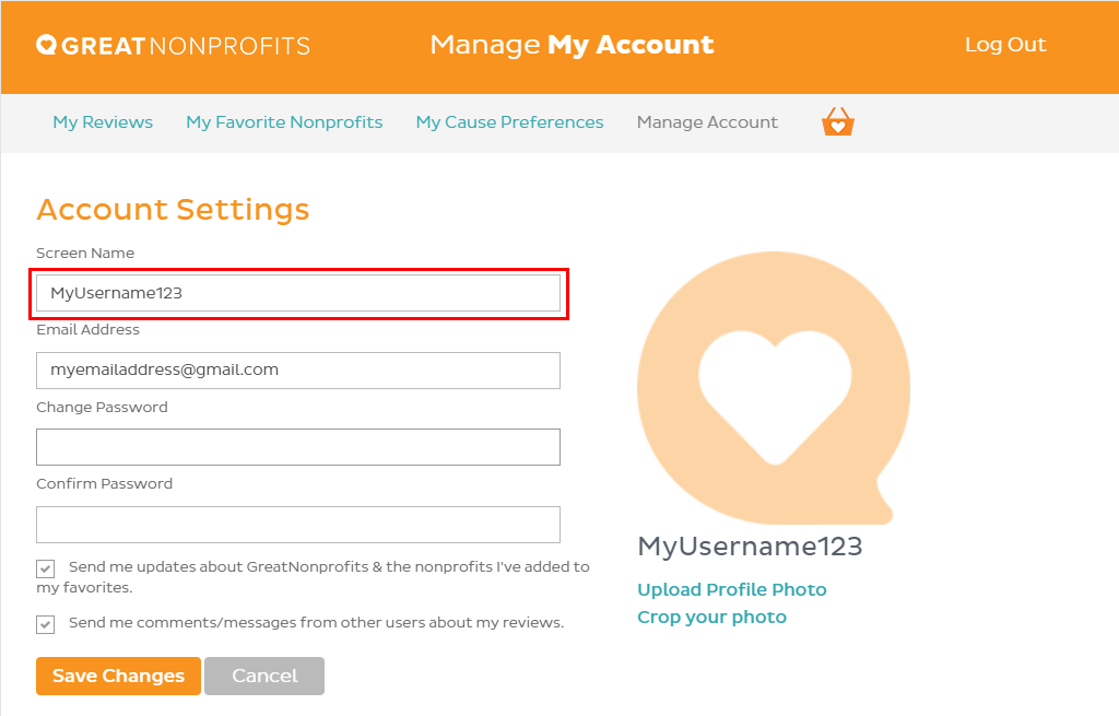 1. To change your username/screenname, please log in to GreatNonprofits.