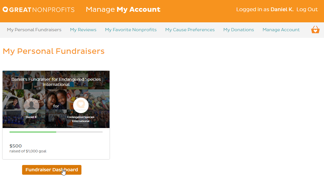 - Under your Fundraiser, click Fundraiser Dashboard and then Edit Fundraiser.